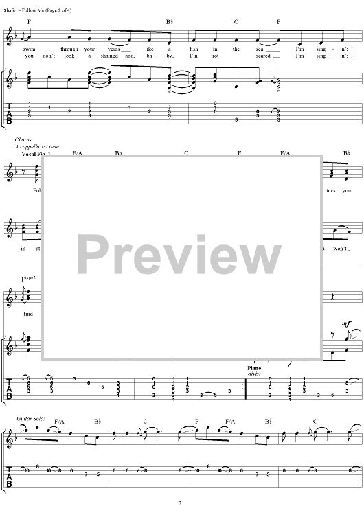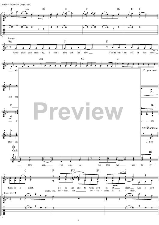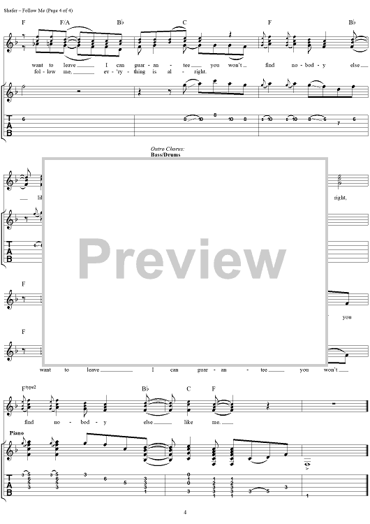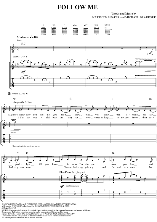 Digital Sheet Music for Follow Me by Matthew Shafer, Uncle Kracker, Michael Bradford scored for Guitar Tab/Vocal; id:284922