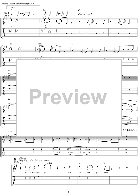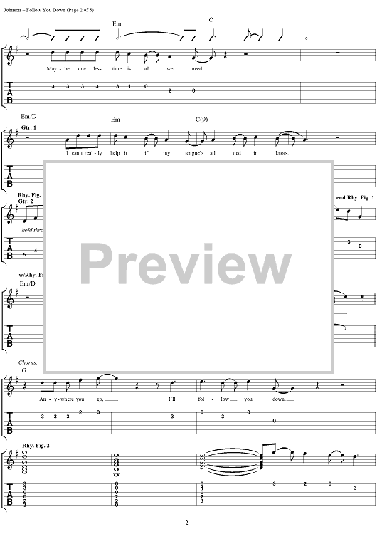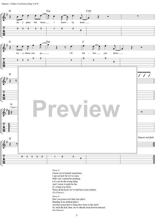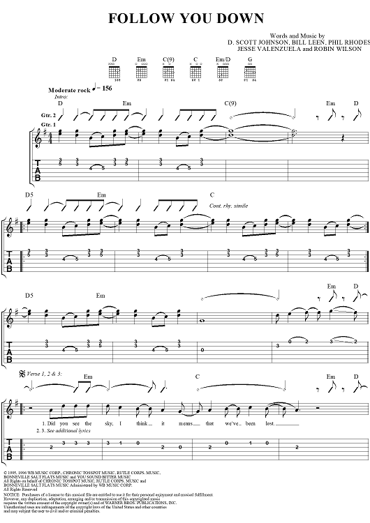 Digital Sheet Music for Follow You Down by D. Scott Johnson, Bill Leen, Phil Rhodes, Jesse Valenzuela, Robin Wilson, Gin Blossoms scored for Easy Guitar Tab/Vocal; id:119324