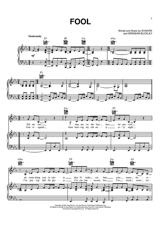 Digital Sheet Music for Fool by Shakira, Brendan Buckley scored for Piano/Vocal/Chords; id:387206