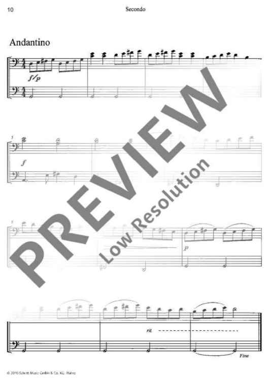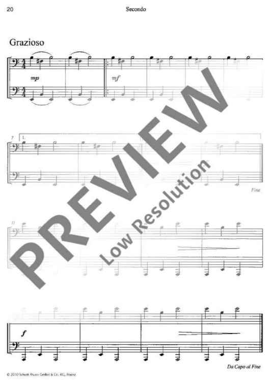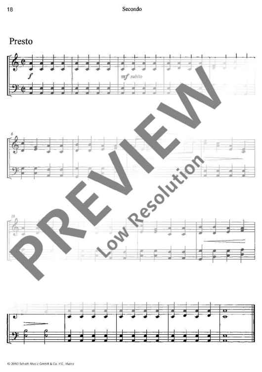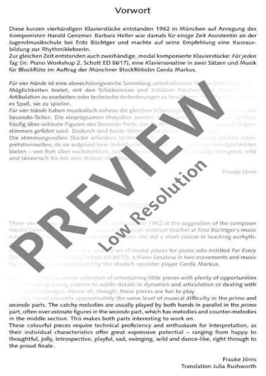 Barbara Heller's collection 'For 4 Hands' contains short pieces for piano duet. The entertaining little pieces were created in Munich in 1962 during her time as teacher at the Youth Music School. The cycle offers numerous opportunities to work on the subtleties of dynamics and articulation with second-year pupils, and for first experiences in ensemble playing. The primo and secondo parts correspond to the same level of difficulty. 'For 4 Hands' is therefore also suitable for group lessons. Both parts play the catchy tunes alternately and are therefore equally enjoyable to practise. From cheerful via pensive, sad, swinging and wild to dance-like, the concise little pieces provide the opportunity for many different types of expression. An entertaining musical experience for two piano players.