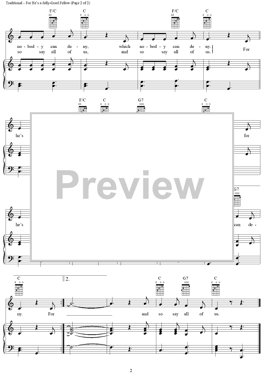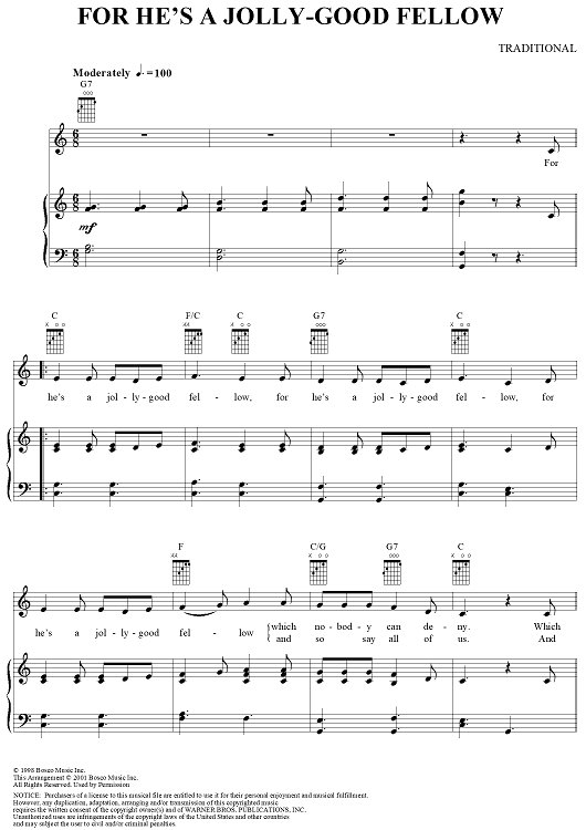 Digital Sheet Music for For He's a Jolly-Good Fellow by Traditional scored for Piano/Vocal/Chords; id:289037