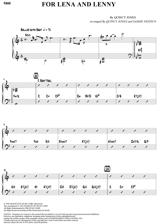 "For Lena and Lenny - Piano" Sheet Music by Quincy Jones