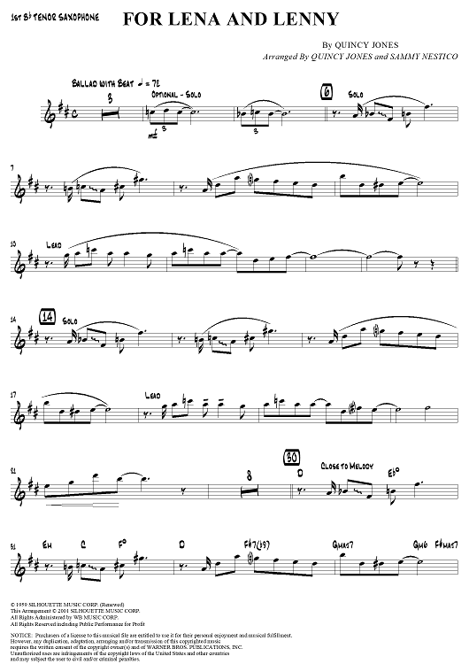 "For Lena and Lenny - Tenor Saxophone 1" Sheet Music by Quincy Jones