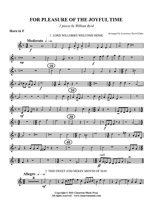 "For Pleasure of the Joyful Time - Horn in F" Sheet Music by William Byrd