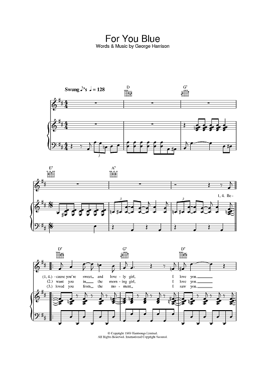 Digital Sheet Music for For You Blue by The Beatles, George Harrison scored for Piano/Vocal/Chords; id:378688