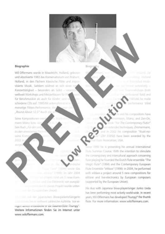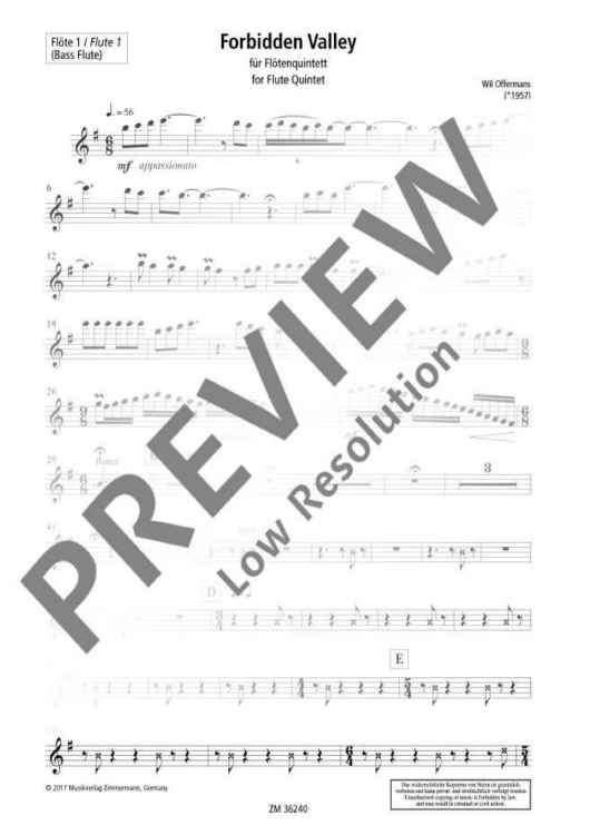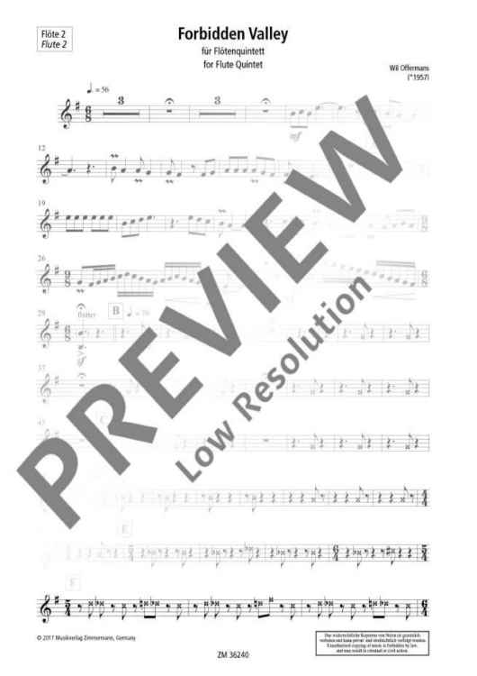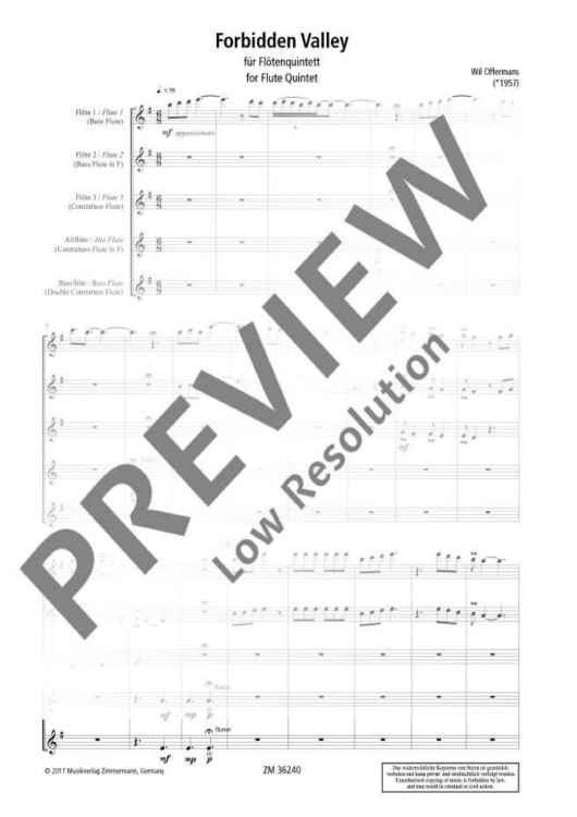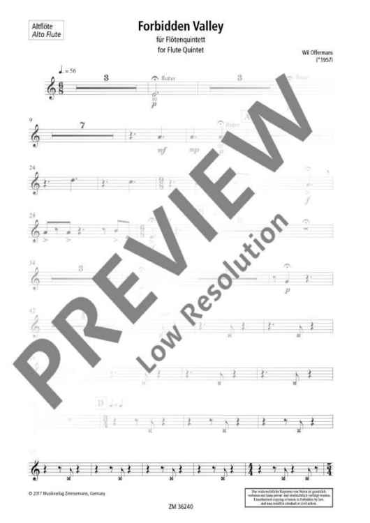 The inspiration for Forbidden Valley came from a dream of a voyage into a deep, dry valley that contained vivid secrets, quiet waters, and timid vegetation. The piece can be played either by a flute quintet composed of three flutes, plus alto and bass flutes, or by a more unusual bass flute quintet composed of bass flute, bass flute in F, contrabass flute, contrabass flute in F and a subcontrabass flute. All parts for this arrangement are also included in this publication. There are some advanced playing techniques, especially sound and tongue pizzicato.