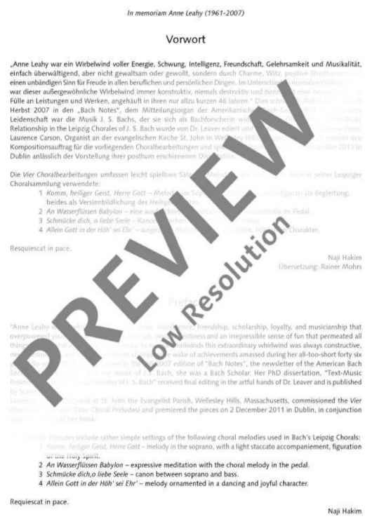 Hakim’s Four Chorale Preludes include rather simple settings of the following choral melodies used in Bach's Leipzig Chorals: No. 1 Komm, heiliger Geist, Herre Gott - melody in the soprano, with a light staccato accompaniment, figuration of the Holy Spirit. No. 2 An Wasserflüssen Babylons - expressive meditation with the choral melody in the pedal. No. 3 Schmücke dich,o liebe Seele - canon between soprano and bass. No. 4 Allein Gott in der Höh' sei Ehr' - melody ornamented in a dancing and joyful character. The chorale preludes are dedicated to the memory of the american Bach scholar Anne Leahy (1961-2007).