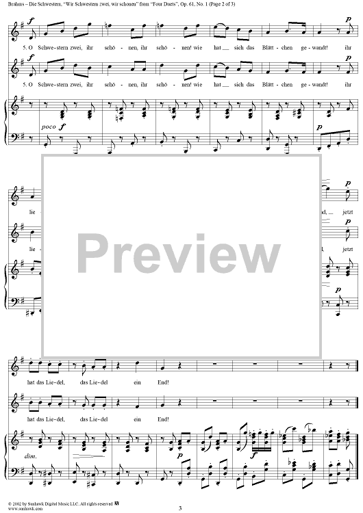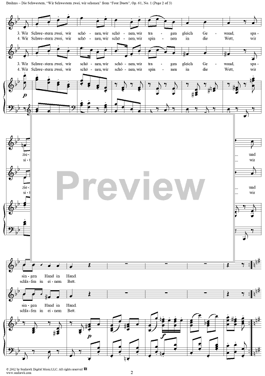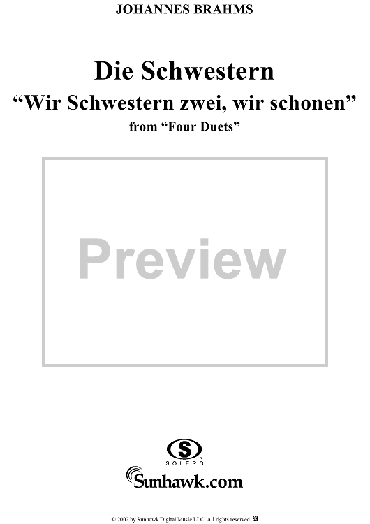 Digital Sheet Music for Four Duets, Op.61, No.1 Die Schwestern, "Wir Schwestern zwei, wir schönen" by Johannes Brahms scored for Soprano/Alto/Piano; id:274949