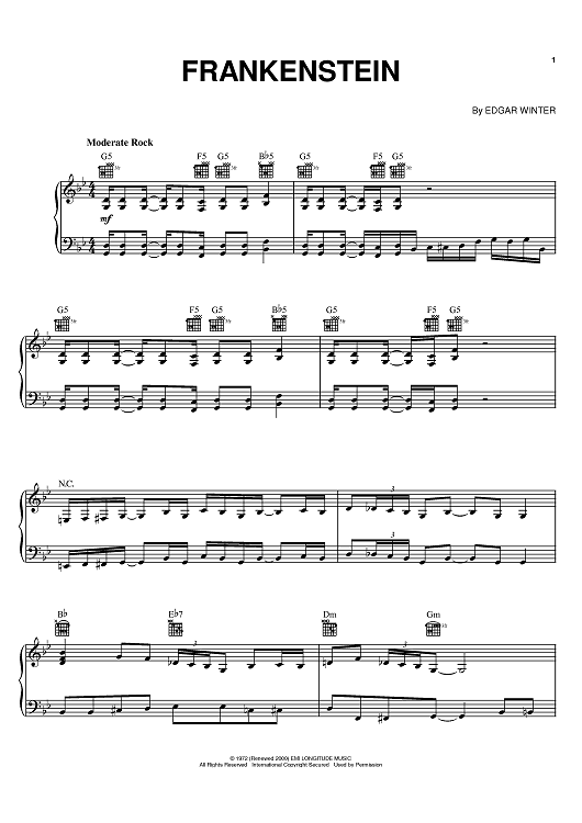 Digital Sheet Music for Frankenstein by Edgar Winter, Edgar Winter Group scored for Piano/Vocal/Chords; id:398086
