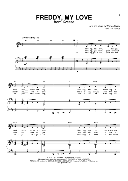 Digital Sheet Music for Freddy, My Love by Cindy Bullens, Warren Casey, Jim Jacobs, Megan Mullally scored for Piano/Vocal/Chords; id:386711