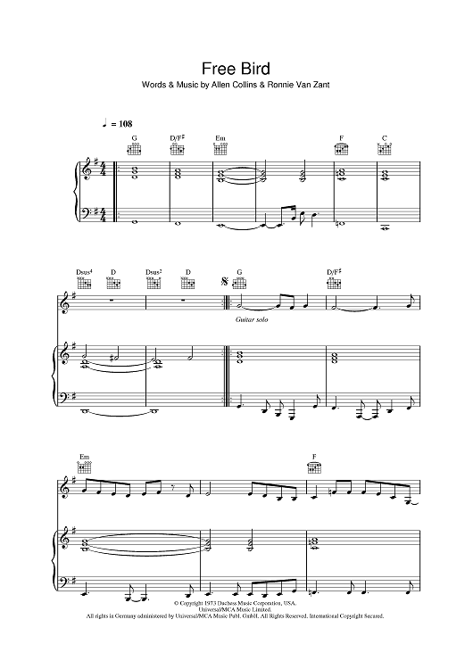 Digital Sheet Music for Free Bird by Lynyrd Skynyrd, Allen Collins, Ronnie Van Zant scored for Piano/Vocal/Chords; id:398694