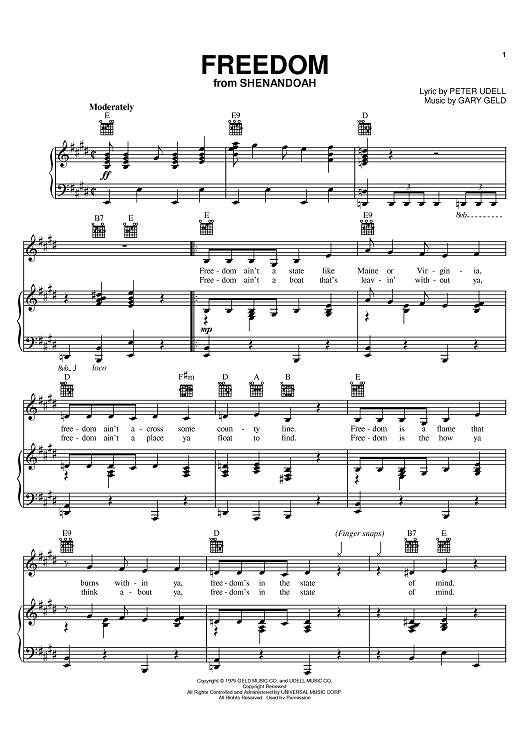 Digital Sheet Music for Freedom by Gary Geld, Peter Udell, John Cullum scored for Piano/Vocal/Chords; id:397747