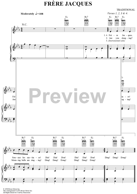 Digital Sheet Music for Frère Jacques by Traditional scored for Piano/Vocal/Chords; id:289038
