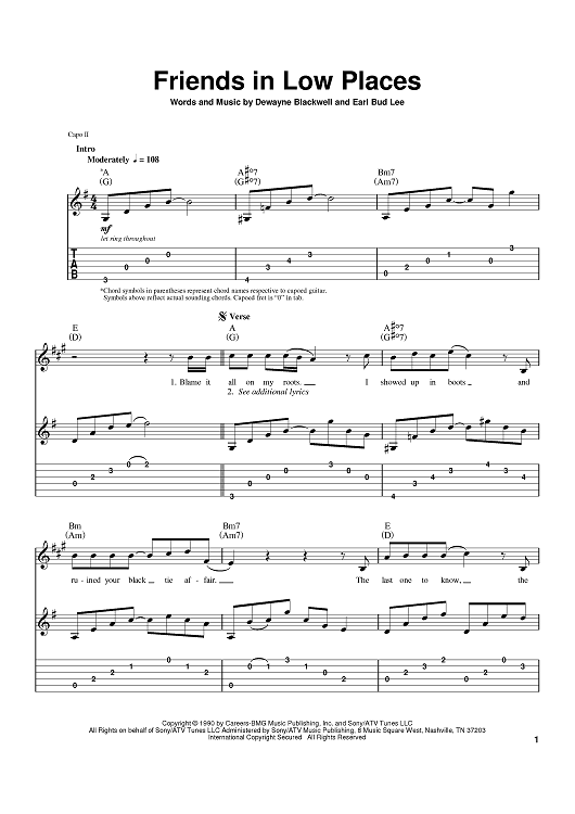 Digital Sheet Music for Friends In Low Places by Garth Brooks, DeWayne Blackwell, Earl Bud Lee scored for Guitar Tab; id:374284