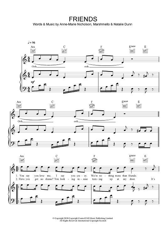 Digital Sheet Music for Friends by Marshmello, Anne-Marie Nicholson, Natalie Dunn scored for Piano/Vocal/Chords; id:466217