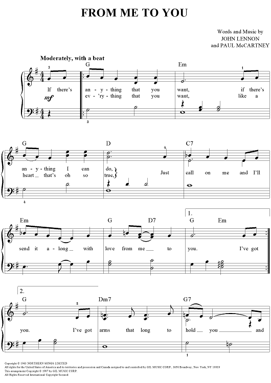 Digital Sheet Music for From Me To You by Paul McCartney, The Beatles, John Lennon scored for Easy Piano/Vocal/Chords; id:450169