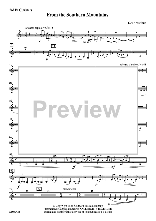 Digital Sheet Music for From the Southern Mountains - 3rd Bb Clarinets by Traditional, Gene Milford scored for Concert Band; id:506510