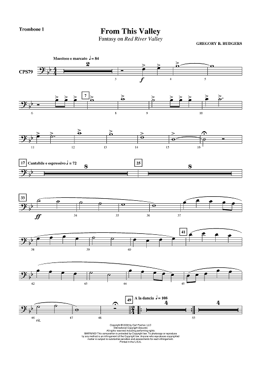 Digital Sheet Music for From This Valley - Trombone 1 by Gregory B. Rudgers scored for Concert Band; id:408795