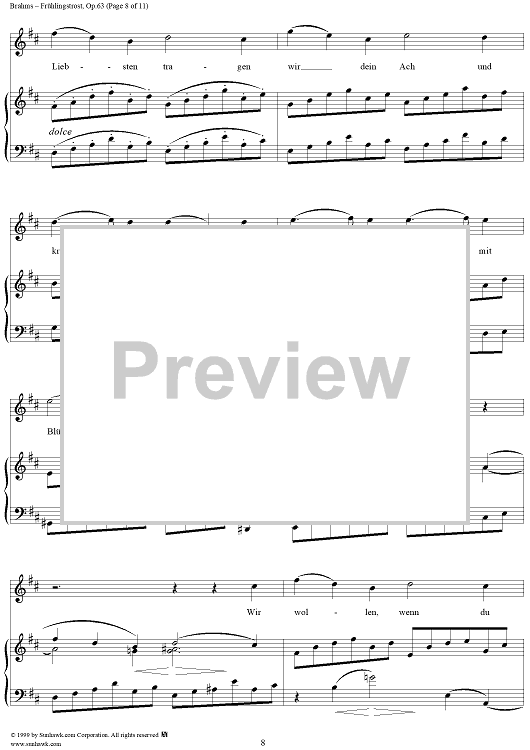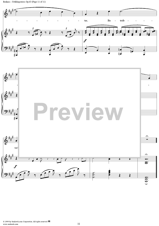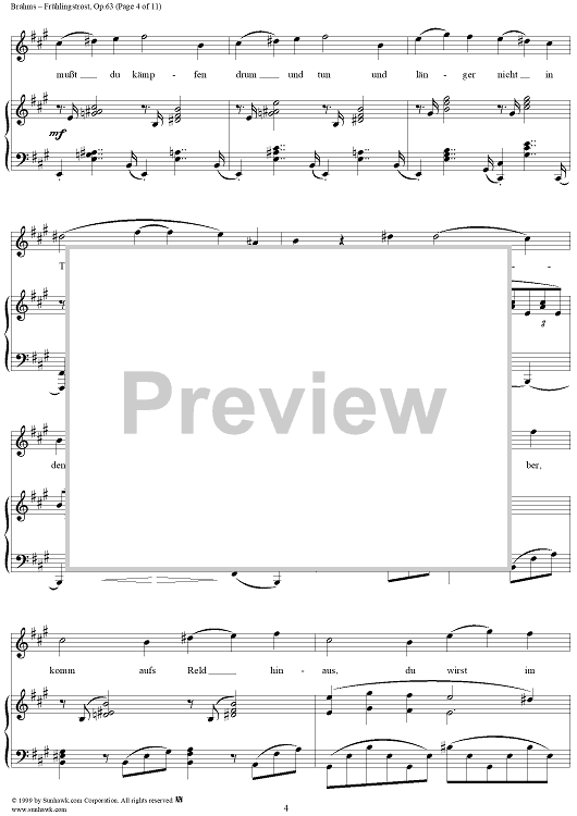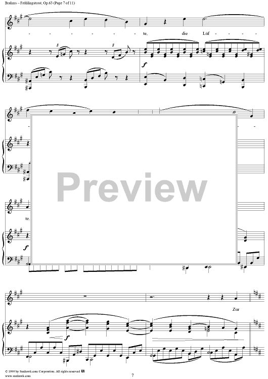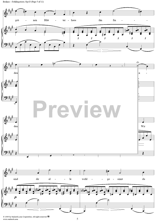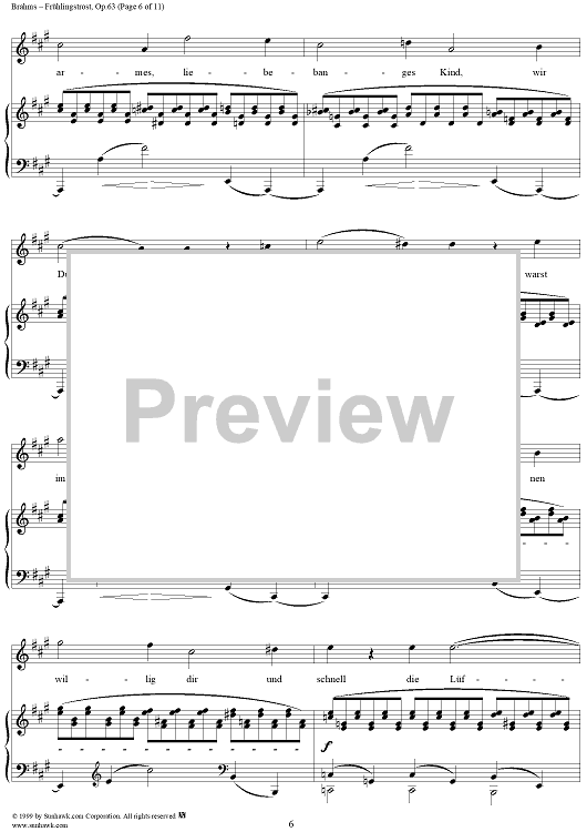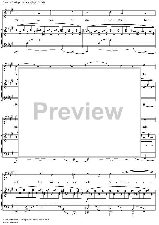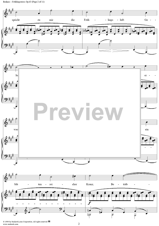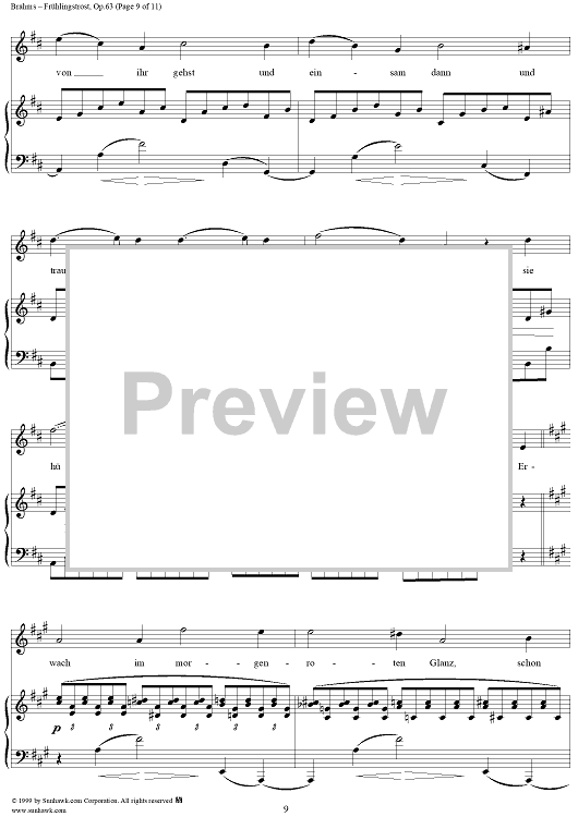 Digital Sheet Music for Frühlingstrost - No. 1 from "Nine Lieder and Songs" Op. 63 by Johannes Brahms, Schenkendorf scored for Voice/Piano; id:273985