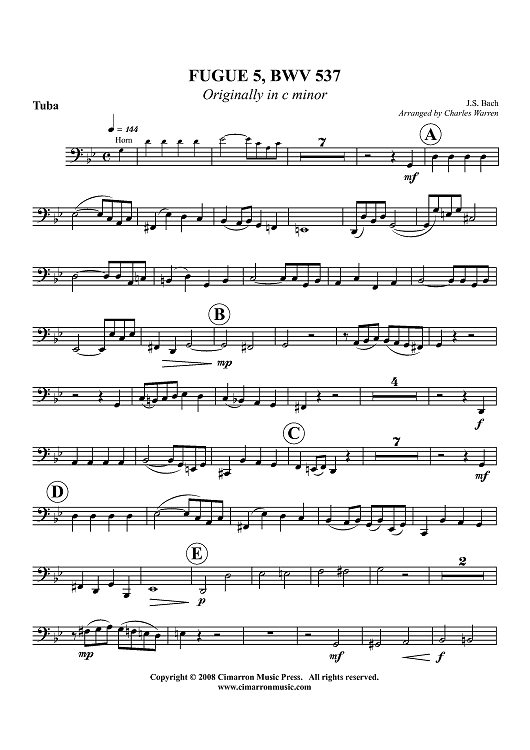 Digital Sheet Music for Fugue 5, BWV 537 (originally in C min) - Tuba by Charles Warren, Johann Sebastian Bach scored for Brass Quintet; id:424310