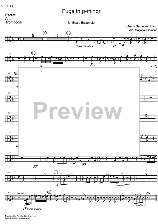 Digital Sheet Music for Fugue g minor BWV 578 - Alto Trombone by Mogens Andresen, Johann Sebastian Bach scored for Brass Ensemble; id:327753