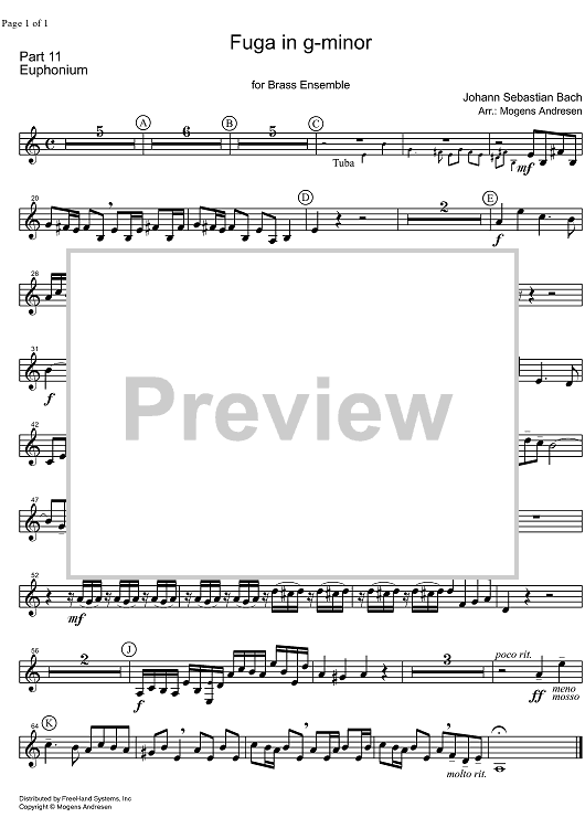 Digital Sheet Music for Fugue g minor BWV 578 - Euphonium by Mogens Andresen, Johann Sebastian Bach scored for Brass Ensemble; id:327758