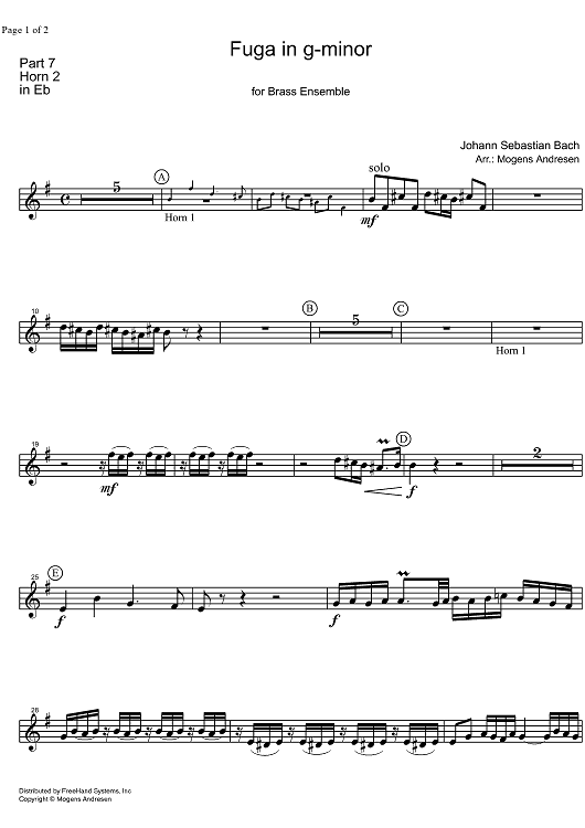 Digital Sheet Music for Fugue g minor BWV 578 - Horn in E-flat by Mogens Andresen, Johann Sebastian Bach scored for Brass Ensemble; id:327761
