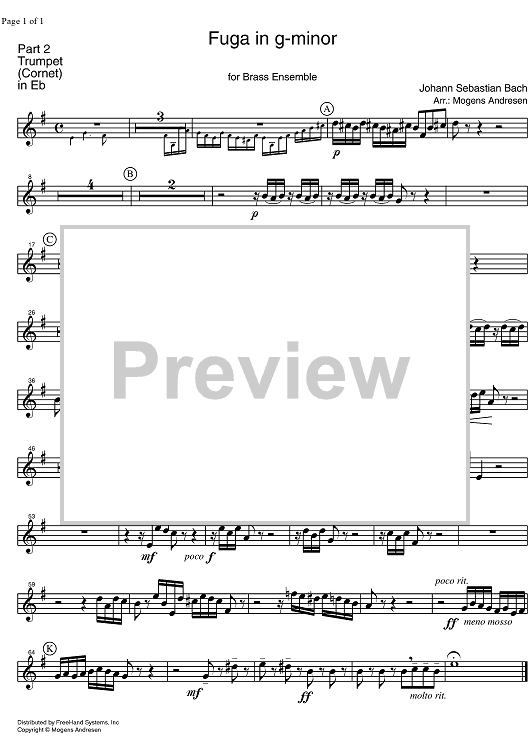Digital Sheet Music for Fugue g minor BWV 578 - Trumpet in B-flat by Mogens Andresen, Johann Sebastian Bach scored for Brass Ensemble; id:327751