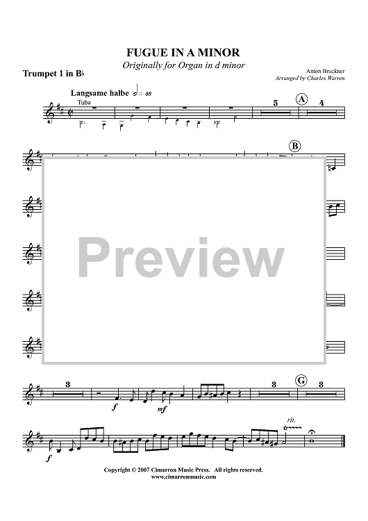 Digital Sheet Music for Fugue in A Minor - Trumpet 1 in Bb by Anton Bruckner, Charles Warren scored for Brass Quintet; id:424327