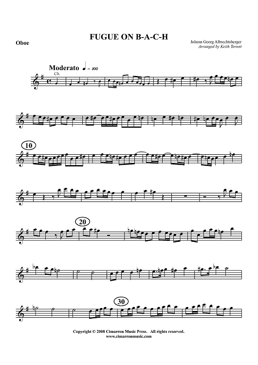 "Fugue on B-A-C-H - Oboe" Sheet Music by Johann Georg Albrechtsberger