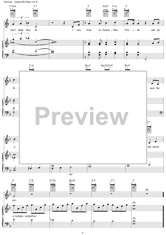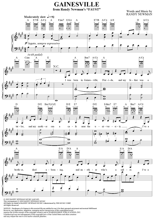 Digital Sheet Music for Gainesville by Randy Newman scored for Piano/Vocal/Chords; id:253259