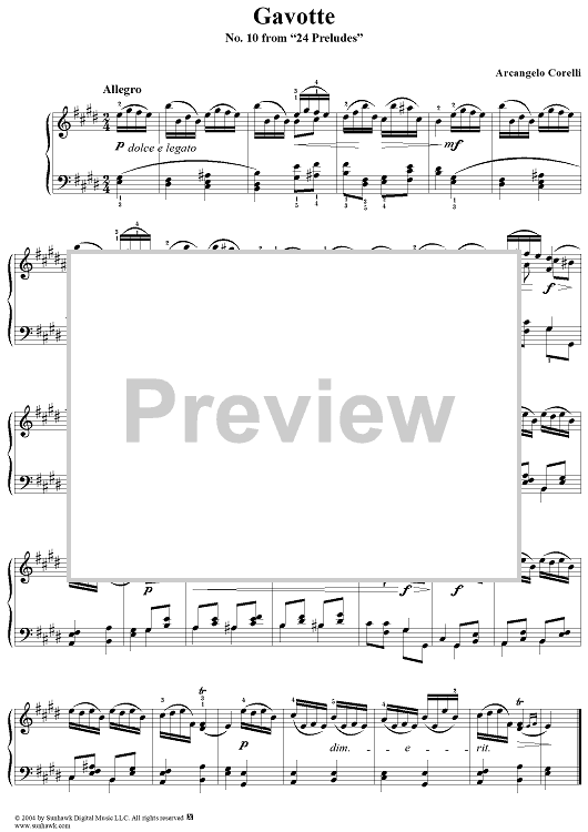 Digital Sheet Music for Gavotte in E Major, No. 10 from "Twenty Four Preludes" by Arcangelo Corelli scored for Piano Solo; id:304060