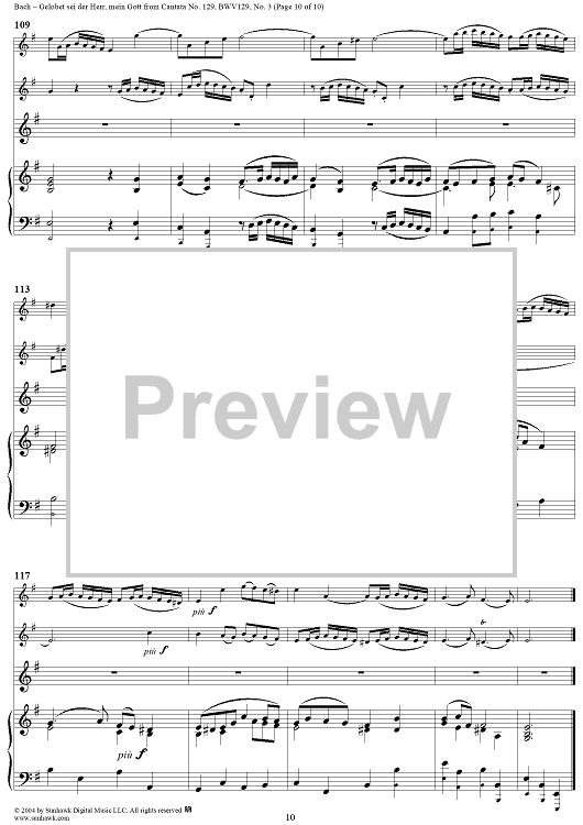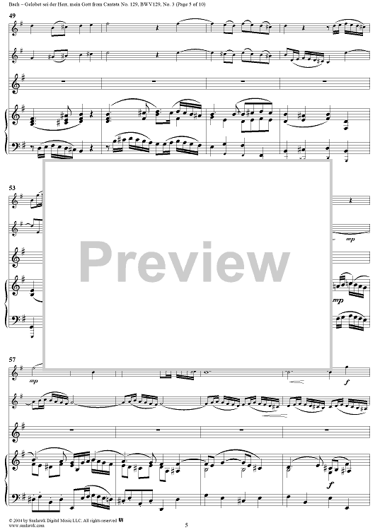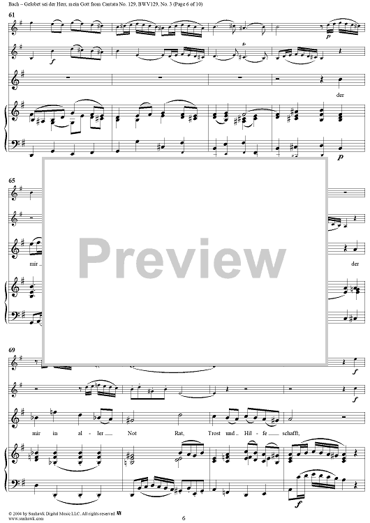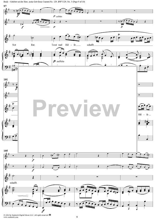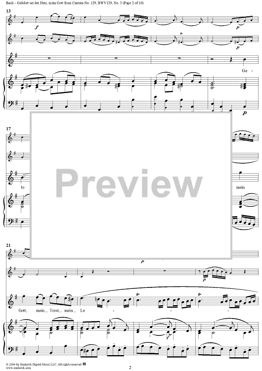 Digital Sheet Music for "Gelobet sei der Herr, mein Gott", Aria, No. 3 from Cantata No. 129: "Gelobet sei der Herr, mein Gott" - Piano Score by Johann Sebastian Bach scored for Soprano, Flute, Violin and Piano or Organ; id:304014