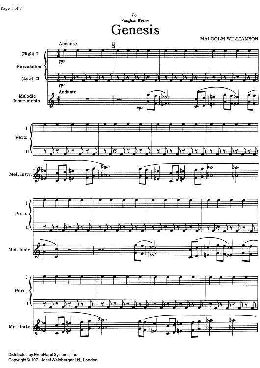 Digital Sheet Music for Genesis by Malcolm Williamson scored for Children and Youth Choir/Percussion/any Melody Instrument/Piano; id:333569