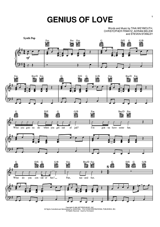 Digital Sheet Music for Genius Of Love by Chris Frantz, Tina Weymouth, Adrian Belew, Steven Stanley, Tom Tom Club scored for Piano/Vocal/Chords; id:398173