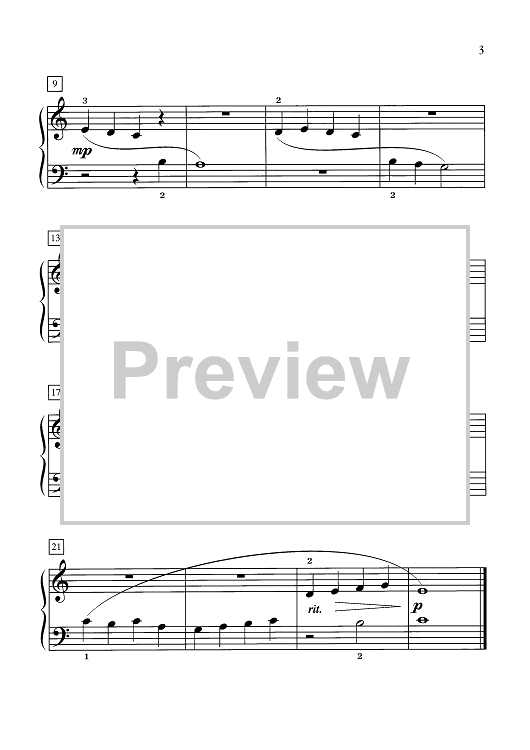 This beginning solo is written in Middle C position with the melody divided between the hands. It provides an excellent reinforcement of intervals (2nds through 5ths) and contains both melodic and rhythmic patterns for ease in learning. The optional teacher duet helps create the flowing sound of a mountain stream and will aid the student in keeping a steady beat.