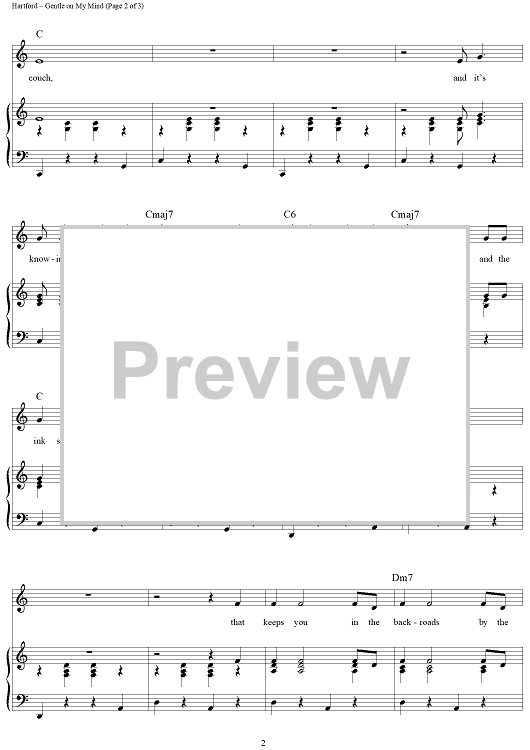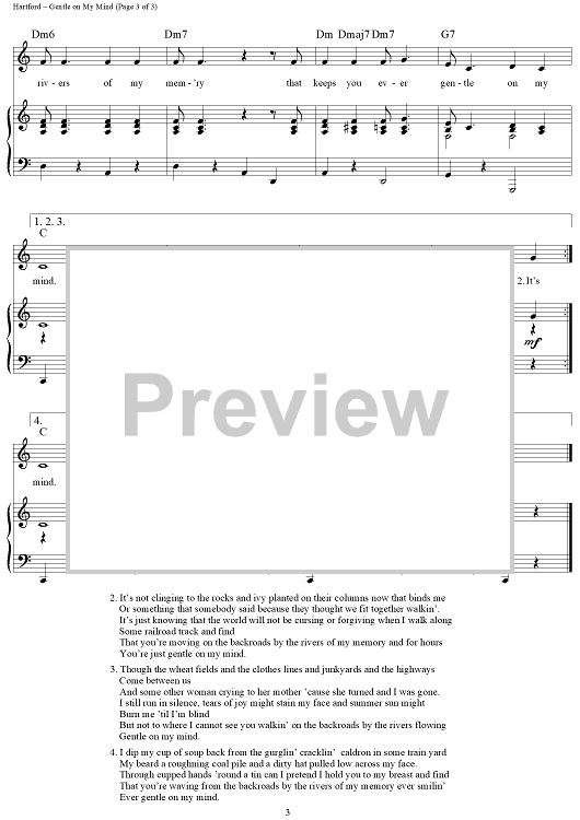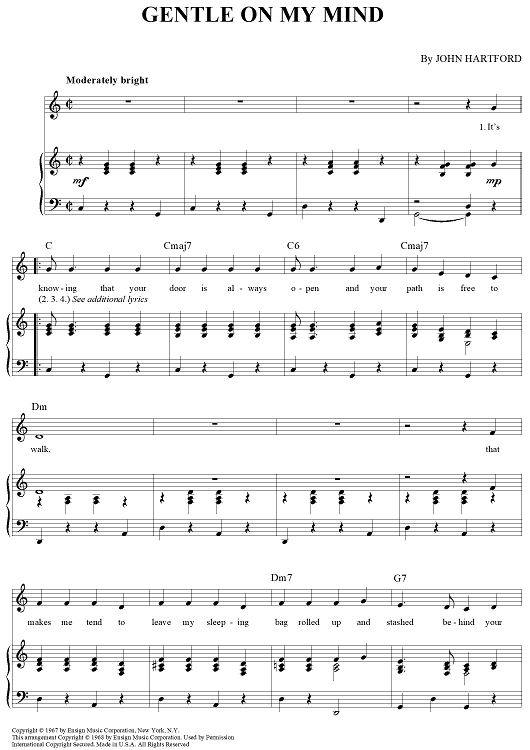 Digital Sheet Music for Gentle on My Mind by Glen Campbell, John Hartford scored for Piano/Vocal/Chords; id:365270