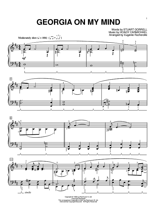 Digital Sheet Music for Georgia On My Mind by Hoagy Carmichael, Stuart Gorrell, Willie Nelson scored for Piano; id:397487