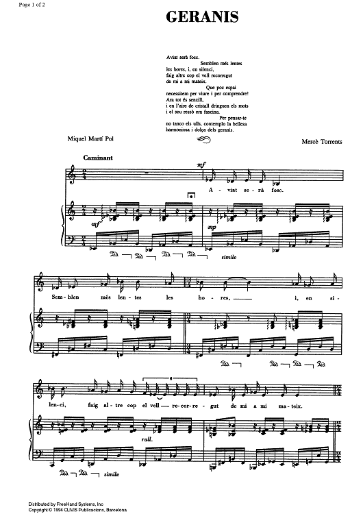 Digital Sheet Music for Geranis - Score by , Mercè Torrents scored for Voice/Piano; id:348939