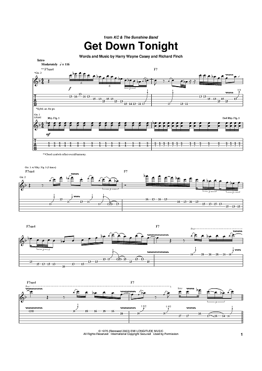 Digital Sheet Music for Get Down Tonight by KC, Richard Finch, KC and the Sunshine Band scored for Guitar Tab; id:373560