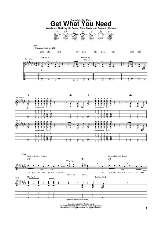 Digital Sheet Music for Get What You Need by Chris Cester, Nic Cester, Jet, Cam Muncey scored for Guitar Tab; id:374961