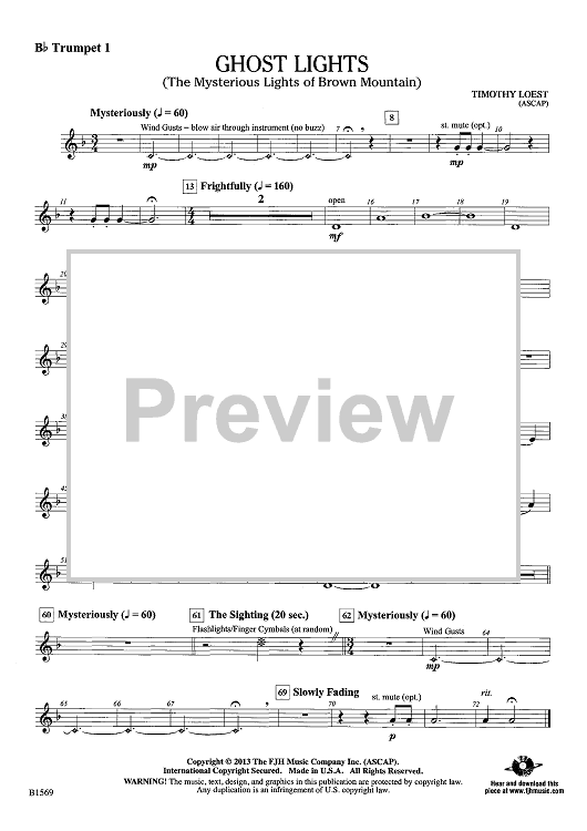 Digital Sheet Music for Ghost Lights - Bb Trumpet 1 by Timothy Loest scored for Concert Band; id:439382