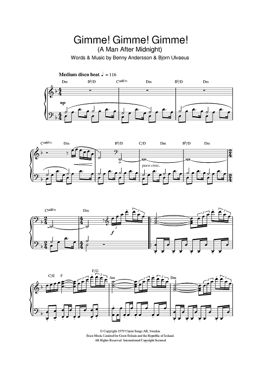 Digital Sheet Music for Gimme! Gimme! Gimme! (A Man After Midnight) by ABBA, Benny Andersson, Bjorn Ulvaeus scored for Piano; id:384500