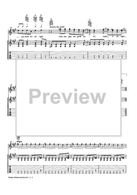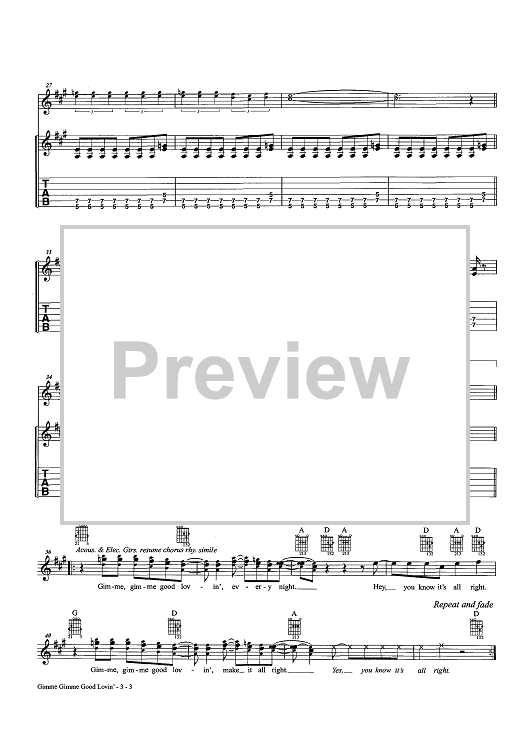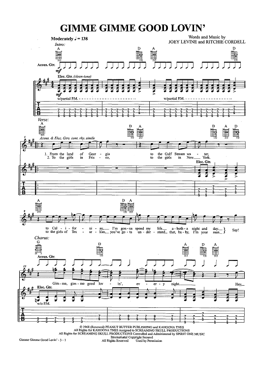 Digital Sheet Music for Gimme Gimme Good Lovin' by Ritchie Cordell, Joey Levine, Crazy Elephant scored for Easy Guitar Tab/Vocal/Chords; id:457210