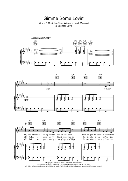 Digital Sheet Music for Gimme Some Lovin' by Steve Winwood, Muff Winwood, Spencer Davis, The Spencer Davis Group scored for Piano/Vocal/Chords; id:394227