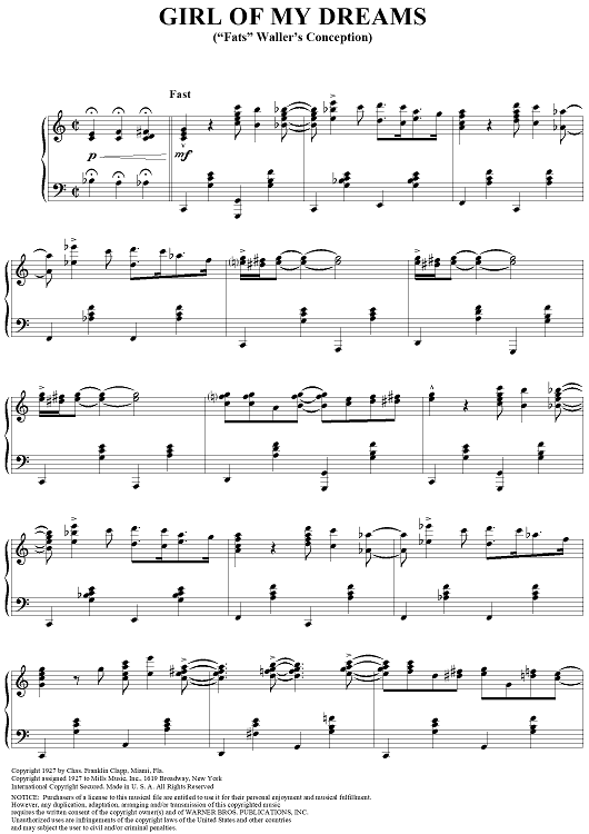 Digital Sheet Music for Girl of My Dreams ("Fats" Wallers Conception) by Fats Waller, Sunny Clapp scored for Piano Solo; id:317021