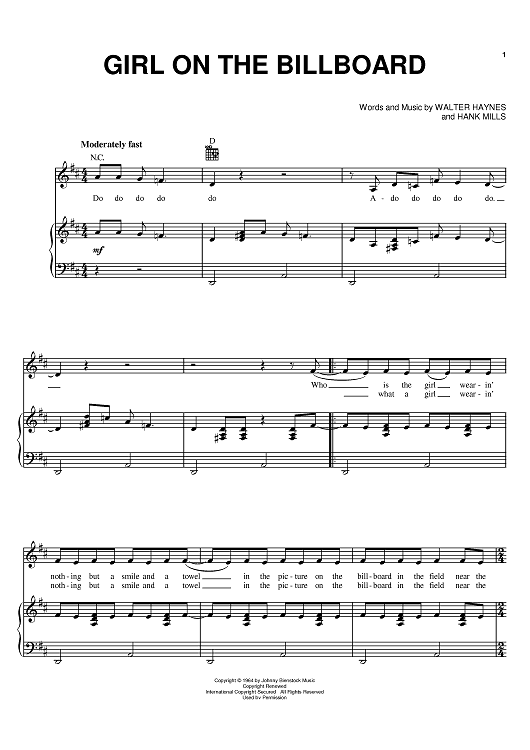 Digital Sheet Music for Girl On The Billboard by Walter Haynes, Hank Mills, Del Reeves scored for Piano/Vocal/Chords; id:388300