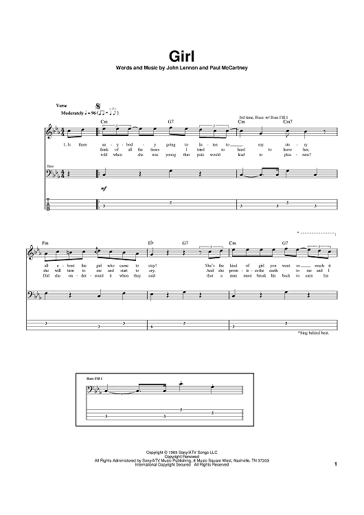 Digital Sheet Music for Girl by Paul McCartney, The Beatles, John Lennon scored for Bass Tab; id:369511
