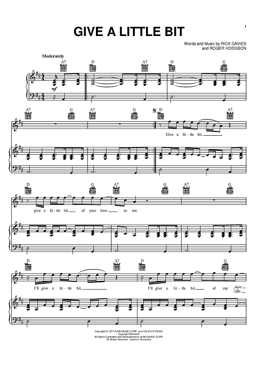 Digital Sheet Music for Give A Little Bit by Rick Davies, Roger Hodgson, Supertramp scored for Piano/Vocal/Chords; id:369034