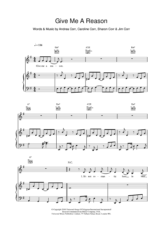 Digital Sheet Music for Give Me A Reason by The Corrs, Sharon Corr, Caroline Corr, Andrea Corr, Jim Corr scored for Piano/Vocal/Chords; id:377113